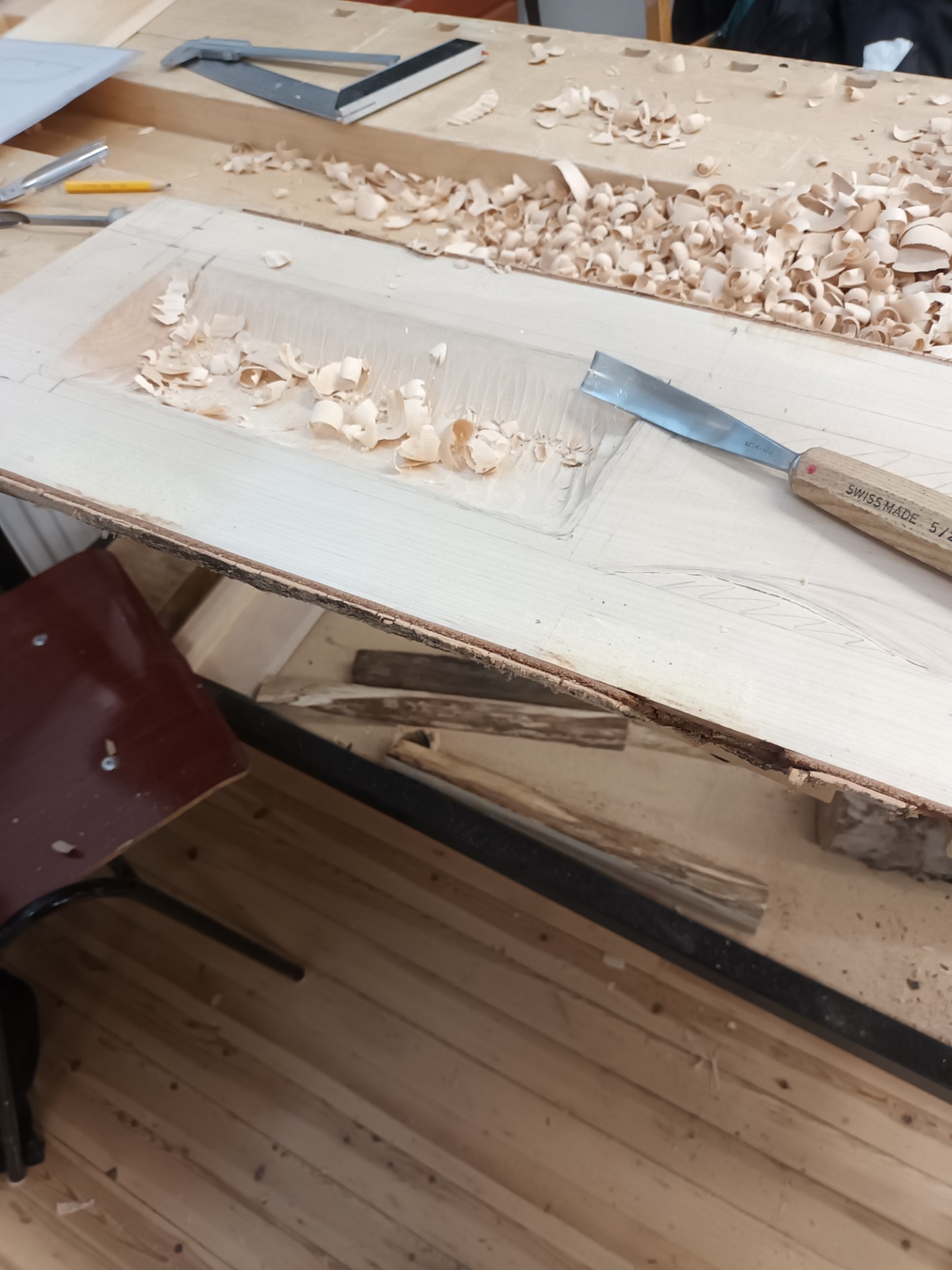Tavoittelin kaikukopan seinämissä noin 5 mm paksuutta. Käytin paksuuden mittaamiseen länkiharppia. Metalliviivain ja työntömitta olisivat mahdollisesti toimineet nekin, mutta halusin minimoida mittaajaperäiset virheet. Tässä vaiheessa prosessia en ollut vielä oppinut syytä sille, miksi seinämät veistetään sellaisiksi kuin veistetään. Ensimmäistä versiota veistäessä olin autuaan tietämätön siitä, millainen vaikutus kannen ja kopan resonoinnilla on sointiin. Näin jälkeenpäin ajateltuna asian olisi ehkä voinut ymmärtää, jos sitä olisi pysähtynyt todella ajattelemaan, mutta into rakentaa soittimeen muoto meni ohi ajatuksesta rakentaa soittimeen ääni.